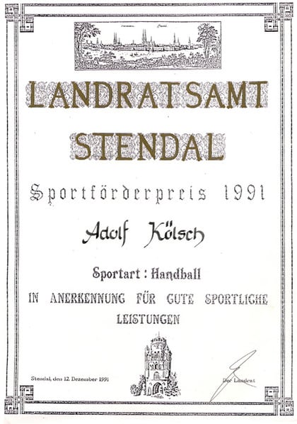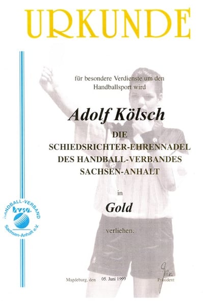Eine der höchsten Handball-Auszeichnungen wurde Addi Kölsch am 04. Juli 2011 anläßlich seines 80. Geburtstages überreicht: Er erhielt die Ehrennadel des Deutschen Handballbundes in Gold !